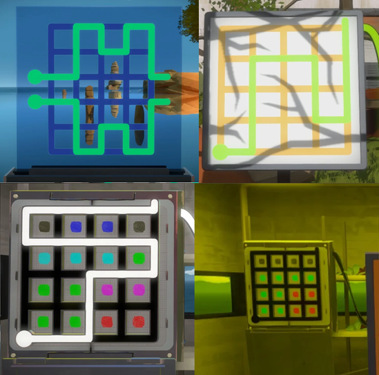 Hay un fantástico nivel que está formado por cuatro laberintos, que el jugador puede ver desde lo alto de una torre. Cada uno de esos laberintos tiene un panel que, aunque parece simple, rechaza la mayoría de las soluciones que intentemos darle. Si miramos mejor nos damos cuenta de que cada panel se corresponde a uno de los laberintos. Pero es que hay más. El primer laberinto tiene vallas que impiden el paso, y sólo hay un camino posible que el jugador puede hacer desde el inicio hasta la salida. Si probamos ese camino en el panel descubrimos que efectivamente es la solución. El segundo no tiene vallas, pero si nos fijamos bien la hierba es más alta en algunas zonas que en otras. Probamos a evitar en el panel las zonas de hierba alta en el mundo